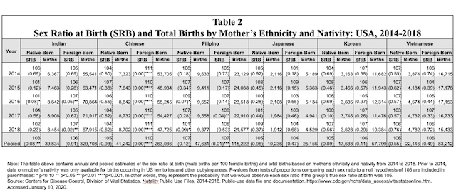 In other words: even though some of these sub-populations (in particular, native-born, Filipino and Vietnamese mothers) reported SRBs in the 106 to 107 range for 2014 to 2018, it is impossible to reject the hypothesis that these were simply chance occurrences—and for the other Asian-American ethnicities (Chinese-, Indian-, Japanese-, and Korean-Americans), native-born mothers reported SRBs of 105 or lower during those same years.