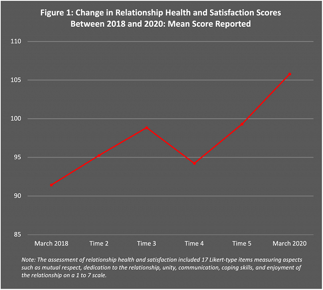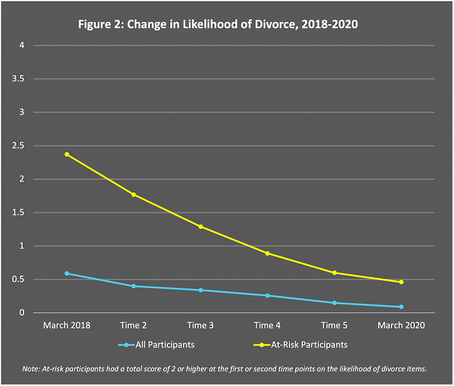 The first cohort of churches completed the program in 2020, allowing for an initial evaluation of the longitudinal changes in participants scores. When all three cohorts have reached the end of the program cycle, there will be a final evaluation. The initial results from Cohort 1 are very promising. Most notably, relationship health and satisfaction increased by nearly one standard deviation among the 188 participants who answered relationship quality questions over the six time points (see Figure 1), and the likelihood of divorce decreased to nearly zero (see Figure 2) among the 172 participants who answered the divorce likelihood items.