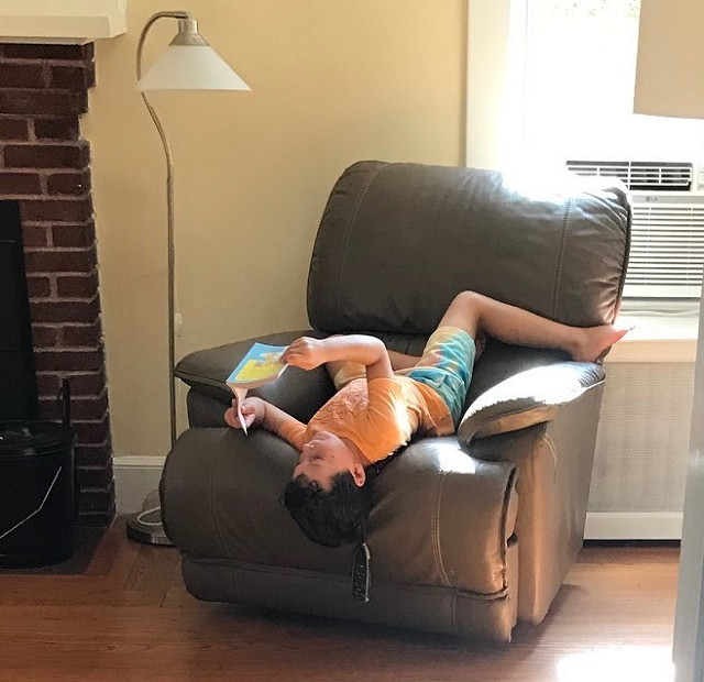 Recently, I wondered about the experiences of other homeschooling parents of young boys and whether they have noticed their boys thriving with the freedom to move around more. The answer is a resounding yes. I heard stories about little boys learning while jumping on trampolines, coloring while listening to “read alouds” in order to “get the energy out,” and learning best when school happened outside. One mother sent me a photo of her son answering math questions upside down on the couch—a pose familiar to me from homeschooling my own son!