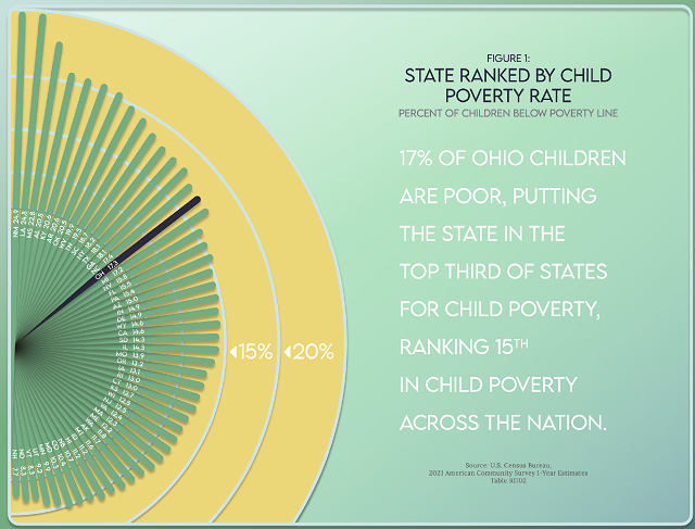 This research could not be more relevant for the state of Ohio. Right now, the American dream is out of reach for too many men, women, and children across Ohio. Tens of thousands of men and women in the state have lost their lives to suicide, drugs, and alcohol in the last decade, such that the state ranks third in deaths of despair. As Figure 1 indicates, 17% of Ohio children are poor, putting the state in the top third (15th) of states for child poverty. And the state ranks in the bottom quintile when it comes to hope. So, when it comes to guaranteeing a “better, richer, and happier life” for all families, Ohio clearly has a way to go.