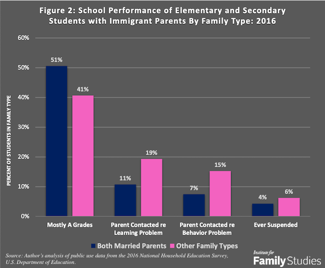 Students of immigrant parents who lived with both married parents were doing better in school than those who lived with single parents, in stepfamilies, or in other family situations. As shown in Figure 2, those in intact families were more likely to get mostly A grades and less likely to have their parents contacted because of their learning problems or misbehavior. Students in intact families were only about half as likely to have been diagnosed with a psychological or physical disability.4