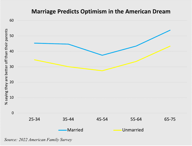 But is there a more optimistic group? Yes, those who are married. Compared to the rest of the public, those who are married appear to hold a more positive view of their own economic trajectories. Findings from the 2022 American Family Survey (conducted annually by researchers at Brigham Young University) illustrate this phenomenon. On one portion of the survey, respondents were asked to evaluate their own economic standing relative to their parents at corresponding times in their lives: are they “better off,” “about the same,” or “worse off” than their parents were? Married respondents were over 10% more likely to believe that they were “better off” than their parents were at their age, in direct contrast to individuals who are not married. Similarly, the married were 10% less likely to believe that they were “worse off,” indicating that their heightened optimism corresponds directly with a departure from pessimism and not merely just a slimming of ambivalence. While some may argue that this optimism is attributable to specific, generational mindsets, it is worth noting that this optimism is consistent across different age groups. Among both the old and the young, married couples maintain their brighter outlook.