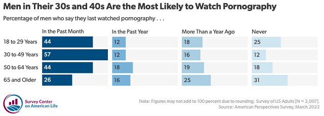 Men in their 30s and 40s report the most frequent use of pornography. A majority (57 percent) of men ages 30–49 report having watched pornography in the past month, and 42 percent say they have watched it in the past week. In contrast, 44 percent of young men and only 26 percent of senior men say they have watched pornography at some point during the past month.