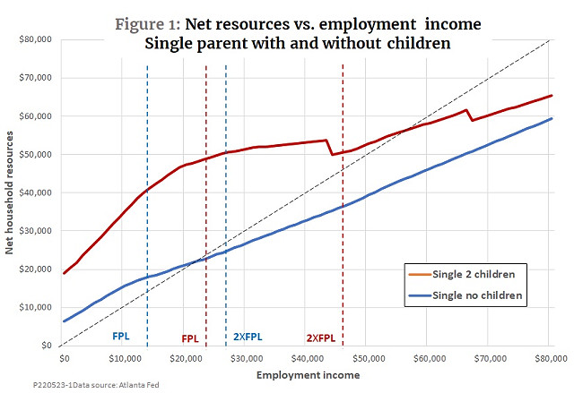 Let’s begin with a review of the patterns of work incentives and disincentives created by the most widely-used public assistance programs. The following chart, based on the Atlanta Fed’s on-line benefit calculator, shows the situation faced by two hypothetical households with a single parent—one with children and one without. Both are assumed to live in Boston, Massachusetts.