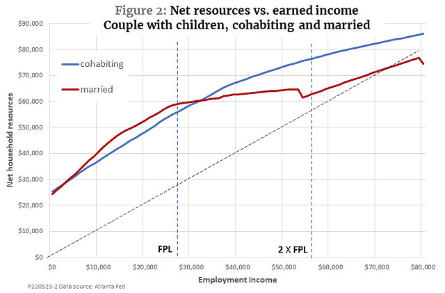 But that is not all. This post shows that poorly designed welfare programs not only discourage work, but also thwart the formation of stable two-family households of the kind that keep children out of poverty, out of prison, and in college. As we will see, the marriage penalty, like work disincentives, hits the near-poor the hardest.