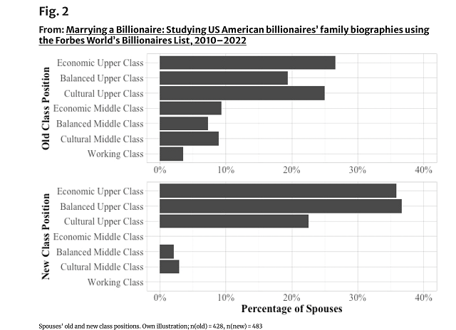 So how do you marry a billionaire? The best way, according to a new research by economist Ria Wilken, is to be in the upper class yourself. Using a unique data set of all American billionaires and their spouses, Wilken found that 95% of the spouses of billionaires were upper class themselves, meaning that their occupations put them in an upper-class position (see Figure 2 below from the study). Those in the upper class were defined as those who have a large volume of capital holdings (the economic upper class); those who have a large amount of cultural capital (the cultural upper class); and those who have both economic and cultural capital (the balanced upper class). The economic upper class includes owners of large businesses, chief executives, and financial brokers; the cultural upper class includes directors and board members of cultural institutions such as museums, top artists, models, producers, as well as top academic positions as professors and scientists; and the balanced upper class includes civil servants, judges, medical doctors, philanthropists, pilots, and top politicians.