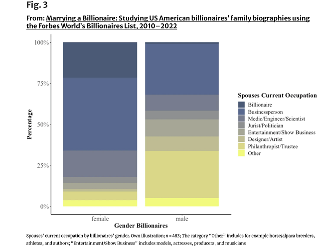 There was also significantly more missing data on the female spouses of male billionaires—meaning they had no documented, public role and likely followed a traditional lifestyle of home and family management. About 33% of the male billionaires had missing data on their spouse’s occupation, compared to about 10% for the female billionaires. The chance of missing information decreased with the number of years a billionaire had appeared on the Forbes list, suggesting that having a public occupation is more common among the female spouses of more recent billionaires. Female spouses of billionaires were more likely to occupy positions in the upper class that depended on their husband’s income, such as positions in charitable and philanthropic organizations, horse breeders, art collectors, or designers. For example, 29% of the male billionaires’ spouses held a position in philanthropy. For such wives, their role is to earn prestige for the family rather than to earn money.