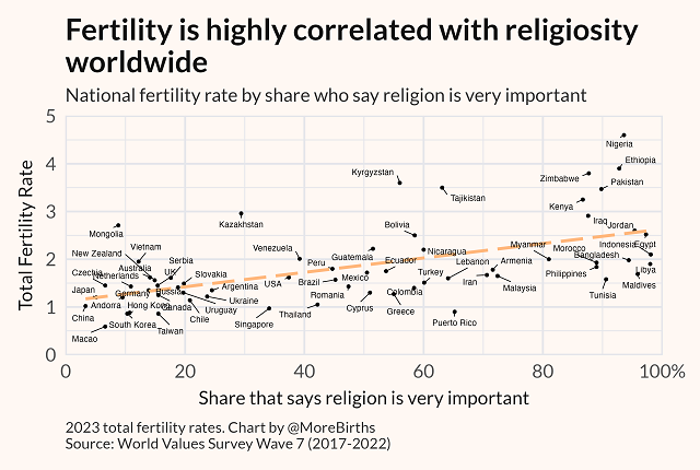 Religiosity, and especially religious attendance, is strongly associated with higher birthrates. Almost every high fertility group one can think of, from the Amish and traditional Catholics in the United States to Laestadian Lutherans in Finland, to orthodox Jews around the world have a religious basis.