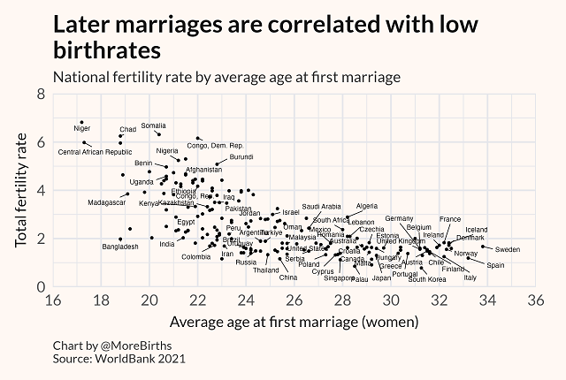 Marriage age matters too. The ability to conceive is highest in the 20s and is quite low by age 40, and so delayed marriage too is a big driver of falling fertility.