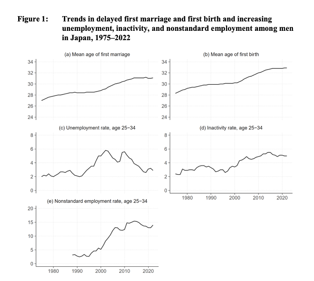 At the same time, Japan has moved from near universal marriage to declining rates of marriage, a pattern common to other east Asian societies. As in the U.S. and other developed societies, average age at first marriage has increased, as has average age at first birth and rates of childlessness. Again, similar to other developed societies including the U.S., there has also been an increase in the number of inactive or unemployed, underemployed, and precariously employed men of prime working age in Japan (see Figure 1).