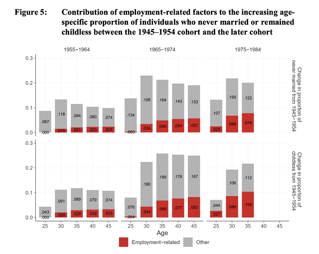 His models found that employment-related factors accounted for 26% of the decline in the chance of first marriage for individuals from the first cohort (born 1945 to 1954) compared to individuals from the latest cohort (born 1975-1984). He also found that employment-related factors contributed 27% to the decline in the annual chance of first birth for individuals from the earliest birth cohort (1945-1954) to the latest birth cohort (1975-1984).