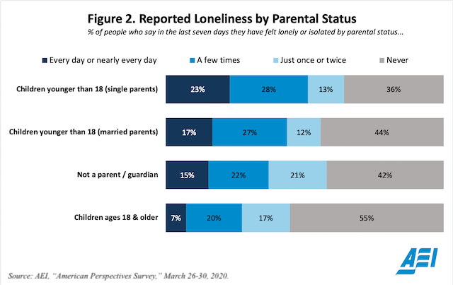 The costs of social distancing are moderated by many factors, including employment, geography, and income. Here we focus on another critical factor: family. A recent survey fielded in late March 2020 by our colleagues at the American Enterprise Institute (AEI) offers unique insights into how marriage and parenthood are associated with feelings of loneliness and isolation amidst the pandemic. The “American Perspectives Survey,” conducted from March 26-30, 2020, asked 2,560 adults questions how frequently they have felt lonely or isolated amidst social distancing practices, as well as questions about their relationship and parental status.
