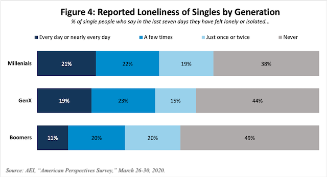 There was also a generational divide in loneliness for single adults, with Boomers reporting loneliness at much lower rates when compared with Millennials, as figure 4 indicates.