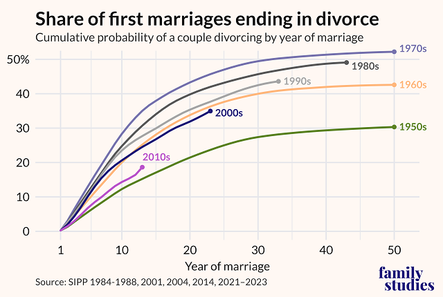 Certainly, because any couple’s risk of divorce is not eliminated until they die, we must be cautious in offering projections about divorce. In general, most divorces take place in the first 15 years of marriage, but if couples marrying in recent years end up seeing a large surge in gray divorce (when marriages break down for couples ages 50 and older), our estimates could be off.