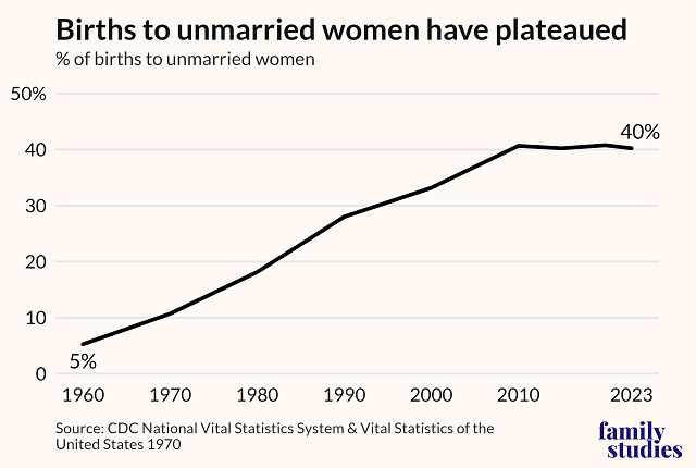 Another key family trend, nonmarital childbearing, has also turned in a new direction. The trend, which had been rising on an almost year-over-year basis since the 1960s, peaked in 2009 at 41% (as the Great Recession took hold) before ticking down to about 40% a few years later, where it stands now. This matters for family stability because children born out of wedlock are significantly more likely to see their parents break up than children born to married parents.