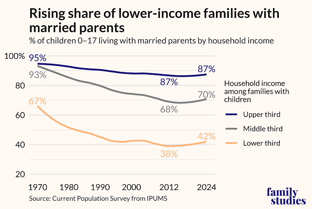The percent of children in lower-income families with married parents rose from 38% in 2012 to 42% in 2024, even as the share of black children in such families rose from 33% to 39% in 2024. This increase in family stability among lower-income and black Americans is especially noteworthy because the nation’s retreat from marriage has been most consequential for these two groups since the 1960s.