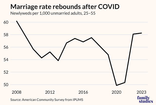 But marriage is not dead yet. The family revolution that took hold in the second half of the twentieth century appears to be spent. If the institution of marriage is understood, fundamentally, as the vehicle for the bearing and rearing of children, there are promising signs that a “marriage renaissance,” to quote sociologist John Seel, may be in the offing. Culturally, books like The Two-Parent Privilege and Get Married, which underline the institution’s value for children, men, women, and the common good, are getting spotlighted in prominent mainstream media outlets like The Atlantic and The New York Times. This suggests the cultural elites who control the commanding heights of the culture are coming around to the idea that marriage matters.