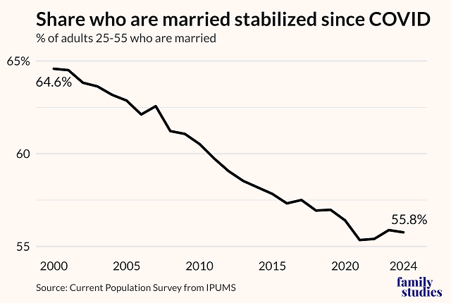 When it comes to adults, we detect no increase in the share of prime-aged men and women (25-55) who are married. While the marriage rate has rebounded since COVID, the share of adults aged 25-55 who are married is holding steady. It is not clear to us if marriage trends for adult men and women have reached a nadir or will begin falling again in short order. But the data suggest that any marriage comeback does not yet extend to adults.
