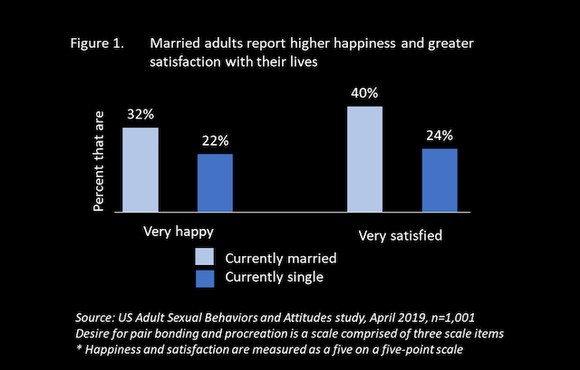 I approached this question as part of an April 2019 study of the sexual behaviors and attitudes of 500 men and 501 women in the U.S. (for the details of the study, please see the footnote).1 I established a baseline by simply comparing the happiness and life satisfaction of married adults to single adults and found results that are similar to prior studies: 32% of married adults say they are generally very happy measured as a five on a five-point scale, compared with 22% of those not currently married. With life satisfaction, the numbers are even more pronounced—40% of married adults are very satisfied with their lives compared with 24% of unmarried adults in the survey.