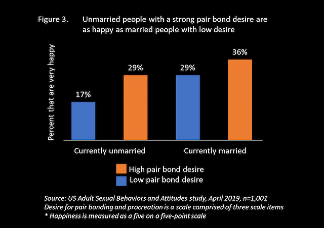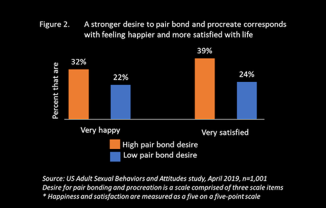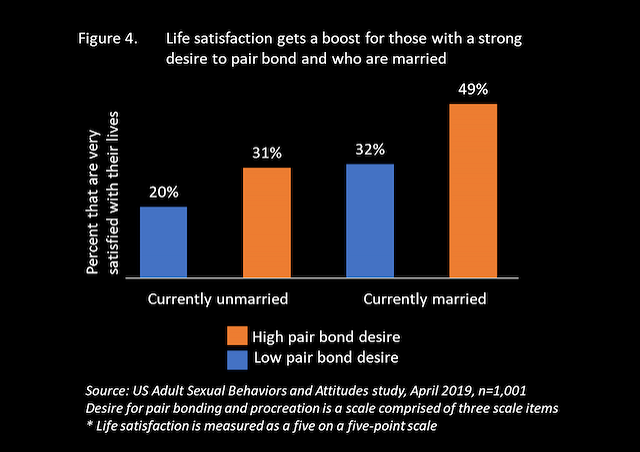 Consider what that says: If you merely have the desire to pair bond and procreate, you are already happier than average and as satisfied with your life on average. But if you act on that desire, your happiness jumps and your life satisfaction practically leaps off the chart.