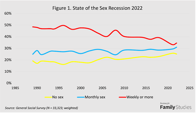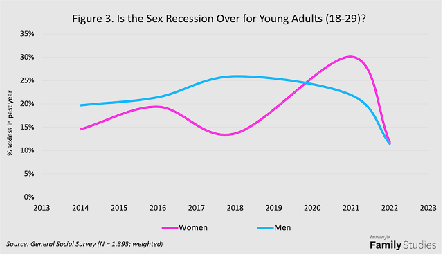 We shouldn’t declare the sex recession over based on just a single year of data—especially a single year that relied on new survey methods—and a fairly small sub-sample of 229 respondents. But the numbers are definitely moving in the right direction. Perhaps the pandemic led young people to reconsider what’s really important in life?