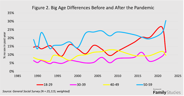 Meanwhile, rates of celibacy are much higher for people aged 18-29 and 50-59. The younger cohort may be focusing on school and careers, or are just slow starters in the game of love. But something big changed after 2020 and the pandemic. Celibacy skyrocketed for Americans in their 50s, while plummeting for adults aged 18-29.