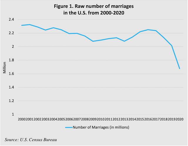 Almost universal data now show that in most parts of the world, marriage rates are decreasing and the proportion of the population who has ever married is shrinking. Perhaps one of the best illustrations of this shifting tide lies in the raw number of marriages documented each year. While the annual marriage rate is a helpful statistic because it adjusts for the size of a population, the raw number of marriages is more illuminating in this case. That is because with most demographic trends, raw numbers tend to increase over time simply by virtue of population increase. The more people, the more marriages, even if the actual marriage rate per capita is decreasing. This is why the marriage rate (usually per 1,000 people) is often a preferred metric when we try to understand trends in behavior. However, when one looks at the raw number of marriages in the U.S., a clear and unique pattern emerges. Despite steady population increases each year, the number of marriages has been decreasing over the last 20 years. While there was a slight uptick in the economic recovery years following the Great Recession, the number of marriages has not only continued to drop more recently but has been dropping at an accelerating rate over the last few years (Figure 1).