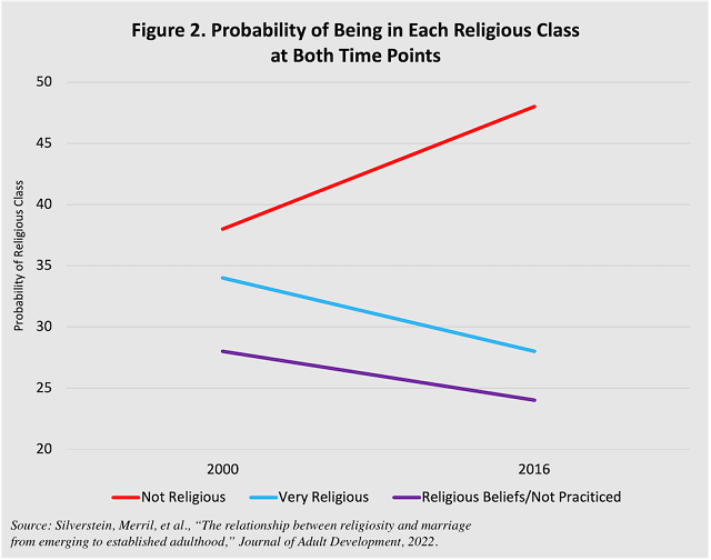 Yet recent trends and studies suggest that more couples than ever before are content with bypassing these benefits. Religious couples will likely always marry at higher rates than non-religious couples. But current trends suggesting that religious couples may soon be the only types of couples that elect to marry indicate that the benefits of marriage may increasingly be left by the wayside for many. Silverstein and colleagues’ study also found that the proportion of highly-religious adults in their sample was significantly lower 16 years later (see Figure 2). Just as marriage rates are slowly declining, as marriage becomes the institution of the religious, the number of religious couples is also decreasing. Both factors compound the same issue. Marriage, a relationship status that has long been associated with numerous positive benefits, is struggling to remain relevant.