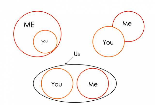 The top left image is one of many possible depictions of enmeshment. One person’s identity is absorbed into the other. The top right image reflects two lives being connected but without having developed an identity of us—or at least, not yet. The final image is meant to portray a healthy, clear sense of us, while retaining a clear understanding that there are two separate individuals. Three identities: You, me, us. You could certainly draw versions of the image on the bottom that reflect individual identities that are largely included in the “us” but with parts unshared or less shared, such as about work or deep interests of the individual identities that are not so clearly a part of what the essence of the “us” is. The key point is that, in a strongly committed relationship, there will be some identity of us, and it will have a boundary.
