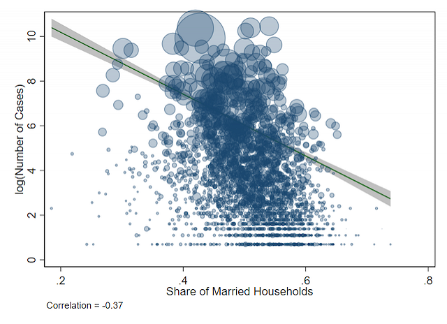 Why would the share of married households be related to the spread of virus? A few theories come to mind: Married households tend to live in single-family homes with more room than an average small apartment, which may reduce their exposure to the virus. Married households also enjoy more income, which may make it easier for them to adhere to social-distancing guidelines or obtain better healthcare options. And married households may also have an easier time maintaining normal levels of mental health.