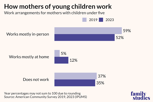 - Between 2019 and 2023, the share of moms working mostly in-person decreased by 7 percentage points, while the share working mostly at home rose by 7 percentage points. That’s a change of nearly one million mothers. Post This
