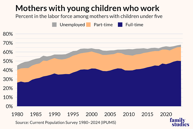 Over the course of the 20th century, more mothers with young children have moved to working outside the home as a result of social, economic, and technological developments. The share of moms with young children in the labor force rose from 8% in 1940 to over 60% by 2000. Following a brief lull in the 2000s, that number had risen to 68% by 2024. This growth has been, by and large, a rise in women working full time. The share of mothers with young children working part time has remained steady, at about 15%, since at least 1980.