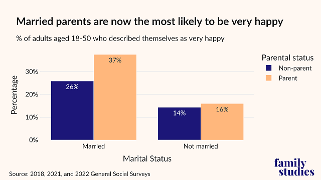 General Social Survey data from 2018 to 2022 corroborates the theory that married parents report the highest levels of happiness. Among married adults, those with children report an 11-percentage-point advantage over their childless counterparts. In addition, married parents are over twice as likely (37%) to report being very happy as unmarried parents (16%). It appears that individuals who are in relationships that create strong familial bonds are the happiest.