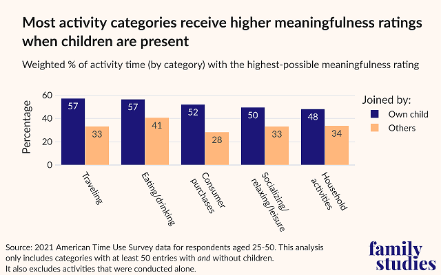 An IFS analysis of the American Time Use Survey (ATUS) found that individuals report higher levels of meaningfulness during activities with children. For instance, 57% of time spent traveling with kids was reported as highly meaningful as opposed to just 33% of time traveling with others. Likewise, 57% of time spent eating and drinking with kids was rated as highly meaningful, but only 41% of the time spent dining with others was. Even mundane household chores were better with kids, with individuals reporting higher levels of meaningfulness when accompanied by children. Sure, the activities measured here don’t include late-night tantrums during diaper changes or messes around the house, but the data point to a reality that is sadly becoming lost to many single and childless young adults: meaning and happiness are found in difficulty.