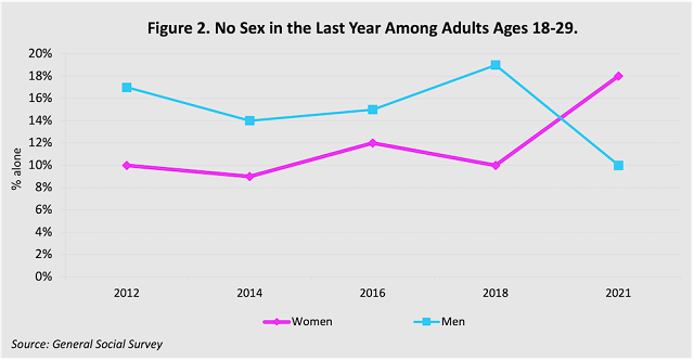 Maybe the rest are hooking up with women who erroneously believe they are in a relationship. Or maybe they’re all playing Call of Duty: Warzone while the women are dating each other. It’s impossible to know for sure with the GSS data. What we CAN know is that the story is considerably more muddled than the one-time snapshot offered by the Pew data, and the gender gap in alone-ness among young adults is not anywhere close to 30 percentage points.