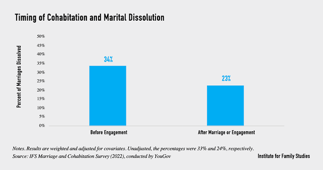 - Those who started cohabiting before being engaged were more likely to experience marital dissolution than those who only did so after being engaged or already being married. Specifically, 34% of marriages ended among those who cohabited before being engaged, compared to 23% of marriages for those who lived together only after being either married or engaged to be married.