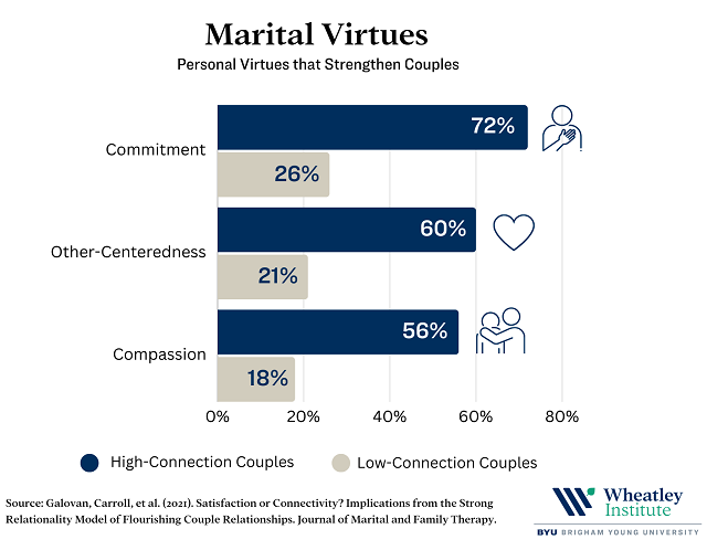 For these analyses, we compared high-connection and low-connection couples on the virtues of commitment, other-centeredness, and compassion. The virtue of commitment entails full fidelity to one’s spouse and a long-term devotion to fostering the permanence of the relationship. This virtue stands in direct contrast to expressive individualism in that it involves expressly not only turning towards one’s spouse, but also turning away from and avoiding consideration of other alternatives. The virtue of other-centeredness entails not being self-centered or selfish, while being kind to others. To foster this virtue, spouses need to learn to value and prioritize each other and seek for ways to be a true support to each other. The virtue of compassion involves being there for others in times of difficulty. Due to the natural challenges of marriage and family life, spouses need to become an enduring support to one another to provide help and assistance to one another.