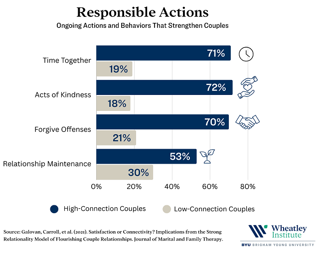 We also compared high-connection and low-connection couples on the level of responsible actions in their relationships. These are proactive actions that spouses can engage in to foster and strengthen their relationship. Specifically, we examined differences between high-connection and low-connection couples on how frequently they engage in four responsible behaviors: