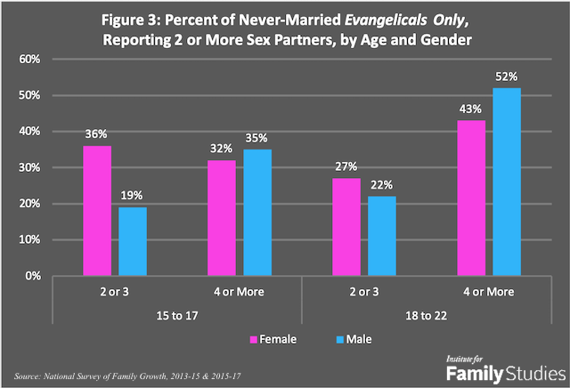 Moreover, as Figure 3 below illustrates, for those who have ever engaged in sexual activity, the percentages who have had multiple sex partners is quite high. Focusing just on Evangelicals, we find that roughly one-third of those ages 15 to 17, and over 40% of females and over 50% of males ages 18 to 22, have had 4 or more opposite-sex partners. Overall, these percentages were not consistently lower than those of the other four Christian groups.
