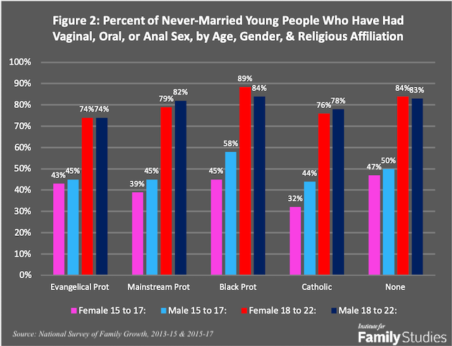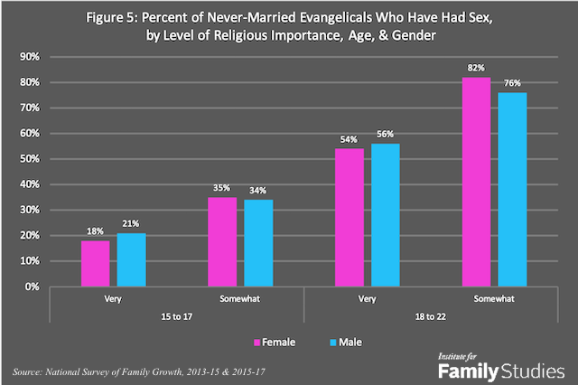 Meanwhile, the GSS shows that among never-married fundamentalist adults between 2008 and 2018, 86% of females and 82% of males had at least one opposite-sex sexual partner since age 18, while 57% and 65%, respectively, had three or more. These percentages were even higher for those under 30.