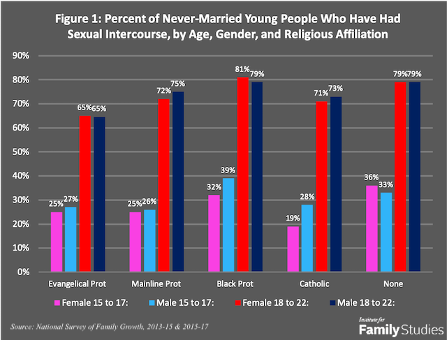 The following figures compare the percentages of never-married respondents in these NSFG cycles, by gender and in two age groups and five major religious affiliation categories, who have ever engaged in sexual intercourse, as well as those who have ever engaged in any sexual activity (vaginal, oral or anal) with an opposite-sex partner.
