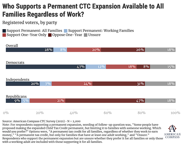 This may help explain why most Americans think a program of permanent, unconditional cash payments would be a mistake. Only 36% support a permanent CTC expansion, and among those, some would prefer it to go only to working families. Only 28% stand with the economists.