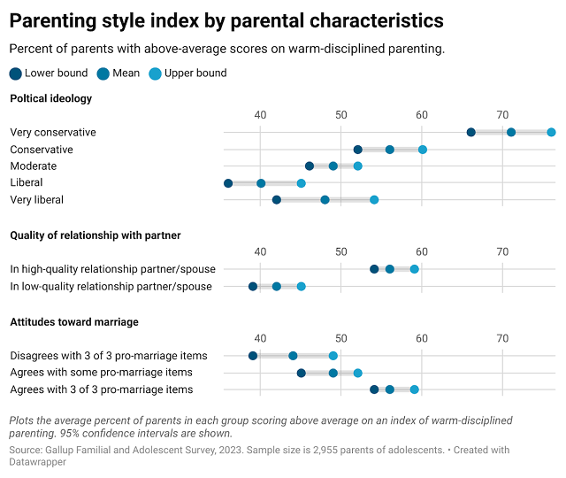 Yet, some parental characteristics do matter. Political ideology is one of the strongest predictors. Conservative and very conservative parents are the most likely to adopt the parenting practices associated with adolescent mental health. They are the most likely to effectively discipline their children, while also displaying affection and responding to their needs. Liberal parents score the lowest, even worse than very liberal parents, largely because they are the least likely to successfully discipline their children. By contrast, conservative parents enjoy higher quality relationships with their children, characterized by fewer arguments, more warmth, and a stronger bond, according to both parent and child reporting.