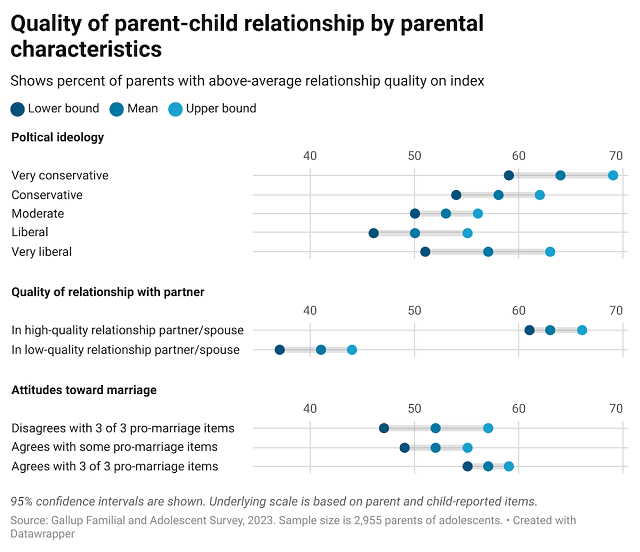 Aside from political ideology, parents who think highly of marriage—by disagreeing that it is an outdated institution and agreeing that it improves the quality of relationships by strengthening commitment—exhibit better parenting practices and have a higher quality relationship with their teens. Parents who wish for their own children to get married someday also tend to be more effective parents. Those who embrace a pro-marriage view on all three have the best outcomes.