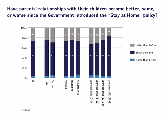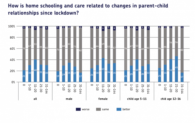 In the May survey, nearly 40% of parents who reduced their hours to look after their children reported their relationships had become better, and only 6% said their relationships had become worse. Parents who spend more time home schooling their children reported having a better relationship than those who spend no time with their children. This could be partly due to the age of the children, however; more parents with younger children reported an improvement in their relationship than parents with older children.