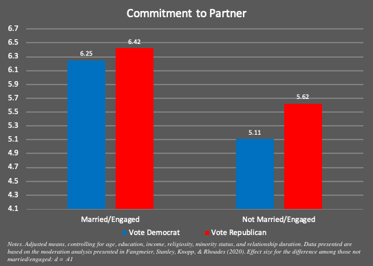 In our study, we found no statistically significant difference between those voting Democrat, Republican, or Independent in overall ratings of relationship adjustment. However, there was a difference in average ratings of commitment to one’s partner, with Republicans reporting higher levels of commitment than Democrats. Further, being in a relationship with someone perceived to be voting Democrat was also associated with lower commitment to one’s partner.