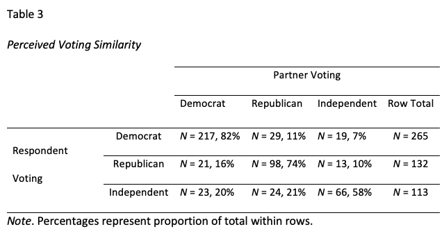 An exploratory finding in our examination of voting similarity might explain these findings suggesting that those partnered with a Democrat experience lower relationship adjustment. Specifically, in more targeted analyses, we found that those voting Republican reported substantially lower relationship adjustment if partnered with a Democrat. We did not find statistically significant differences with any other pairing. These analyses should be considered tentative because, once you get down into specific matches, and especially this one, the sample becomes quite small. In other words, this specific finding may or may not replicate, but it presents an intriguing question to explore further. Broadly, our findings are consistent with those from numerous prior reports from various types of surveys, while adding to the literature and suggesting avenues of further exploration.