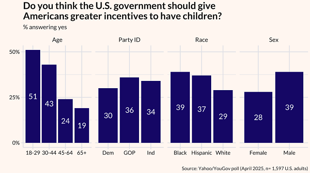 It remains to be seen whether the White House will champion any of these policies that have been proposed, or whether their pro-family efforts will look different. But they would be wise to take key findings from the Yahoo poll: That Americans aren’t yet convinced that low birth rates are a crisis, and that pro-natal policies probably aren’t a political winner—yet. But these issues do poll best among young adults.