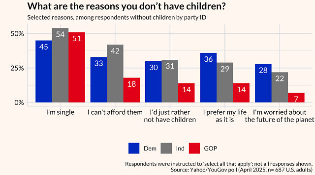 Beyond public opinion towards fertility policies, the Yahoo survey also asked respondents without children why they hadn’t become parents yet. Two things jump out. First, the leading reason respondents give for not having children yet, across various demographic groups, is “I’m single.” If not for that, about one-third of respondents guessed that they’d have had children by now. Secondly, while the overall rates of childlessness didn’t differ, Democratic adults without children are much more likely to relate politically-relevant reasons for why they are childless, like climate change and career concerns, compared to Republicans.