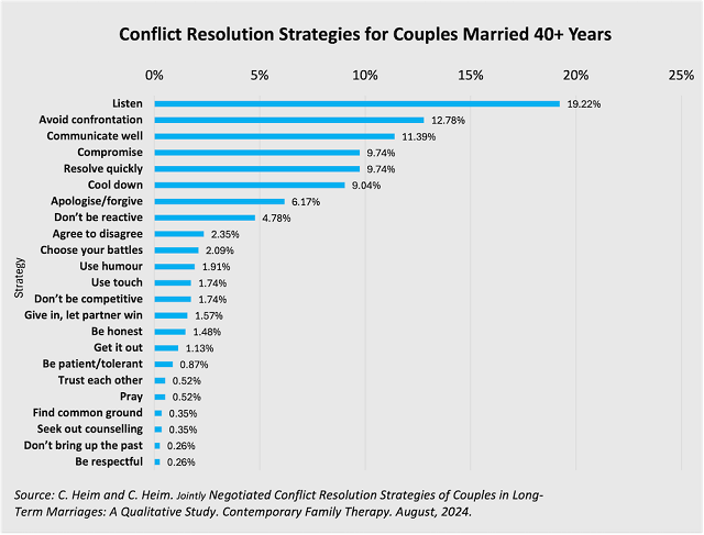 The high number and wide range of strategies suggests that rather than looking to formulas or rules in conflict resolution, two unique people in a long-term union find unique solutions to suit their unique needs. In contrast, however, is that three strategies— listening, avoiding conflict, and communicating well—accounted for 43% of the strategies mentioned; and six—adding compromise, resolving it quickly, and cooling down—accounted for 72% of all the strategies mentioned. These six, then, could form the basis of some ‘tips’ or ‘guidelines’ in developing conflict resolution strategies.